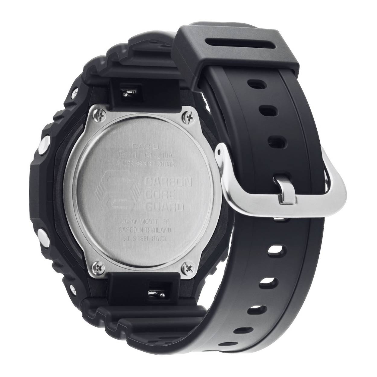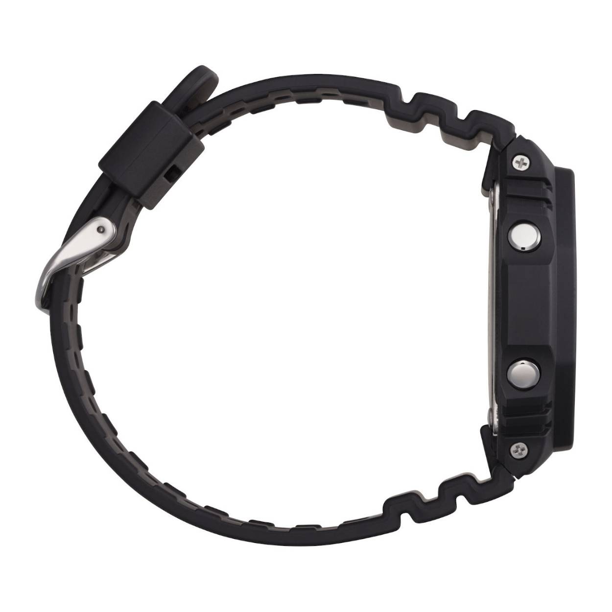 Casio G-Shock horloge. Analoog/digitaal. Zwarte band en kast. Oranje accenten. Stopwatch, wereldtijden en alarm.