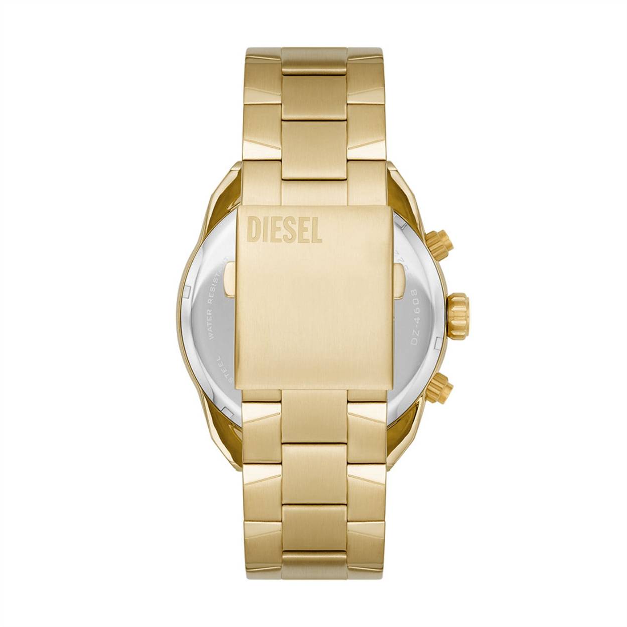 Diesel herenhorloge. Chronograaf. Goudkleurige band en kast. Goudkleurige wijzerplaat met de datum op 4.