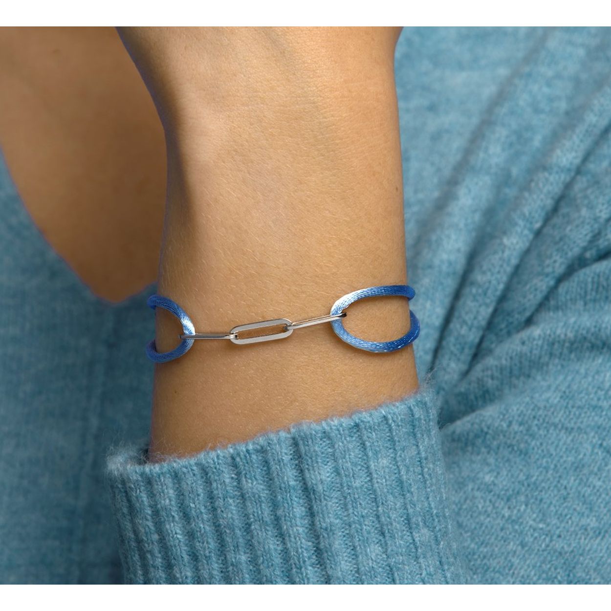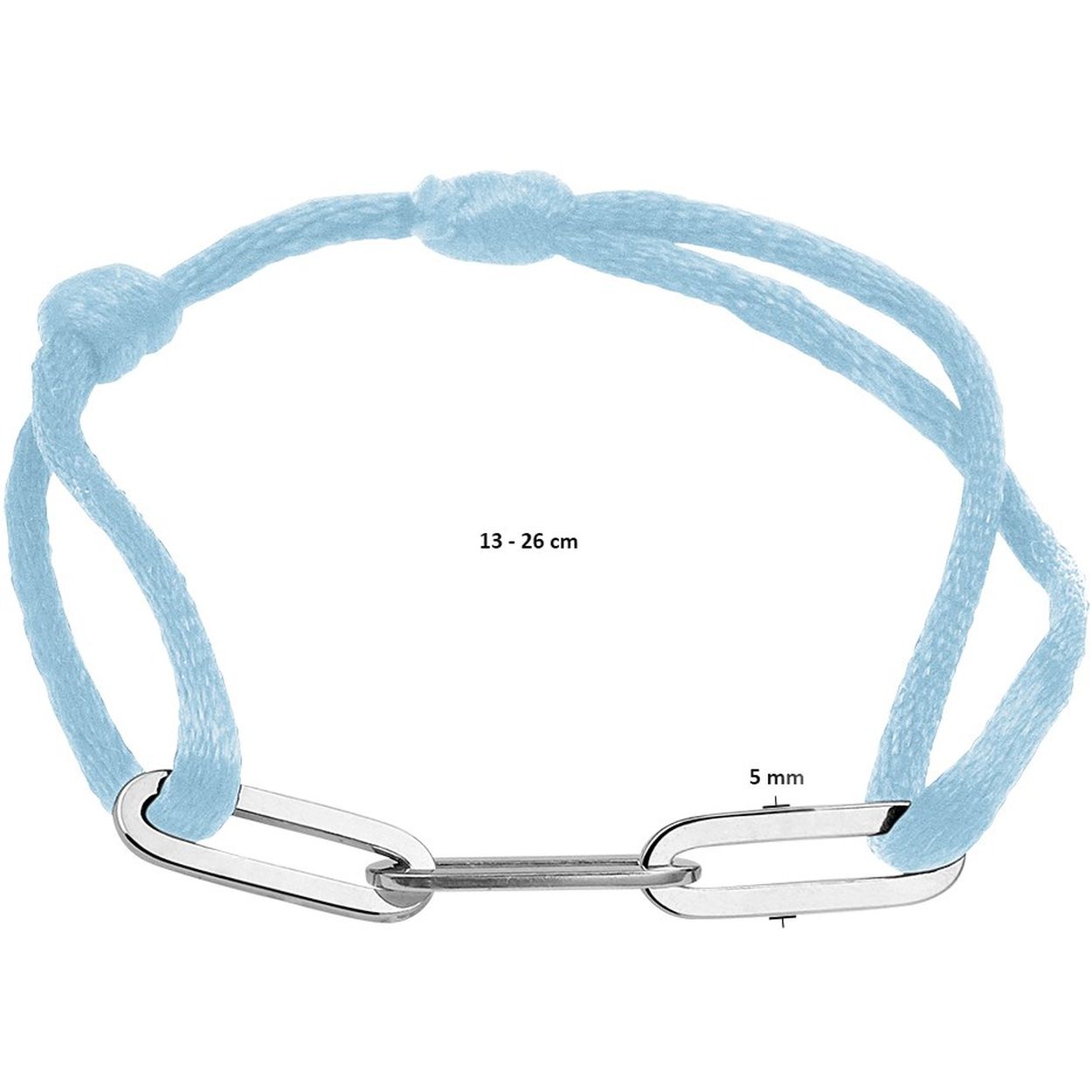 Lichtblauw gevlochten armband uitgevoerd met gerhodineerd 925 zilveren schakels met een breedte van 5mm. De armband heeft draaglengtes van 13 tot 26cm.