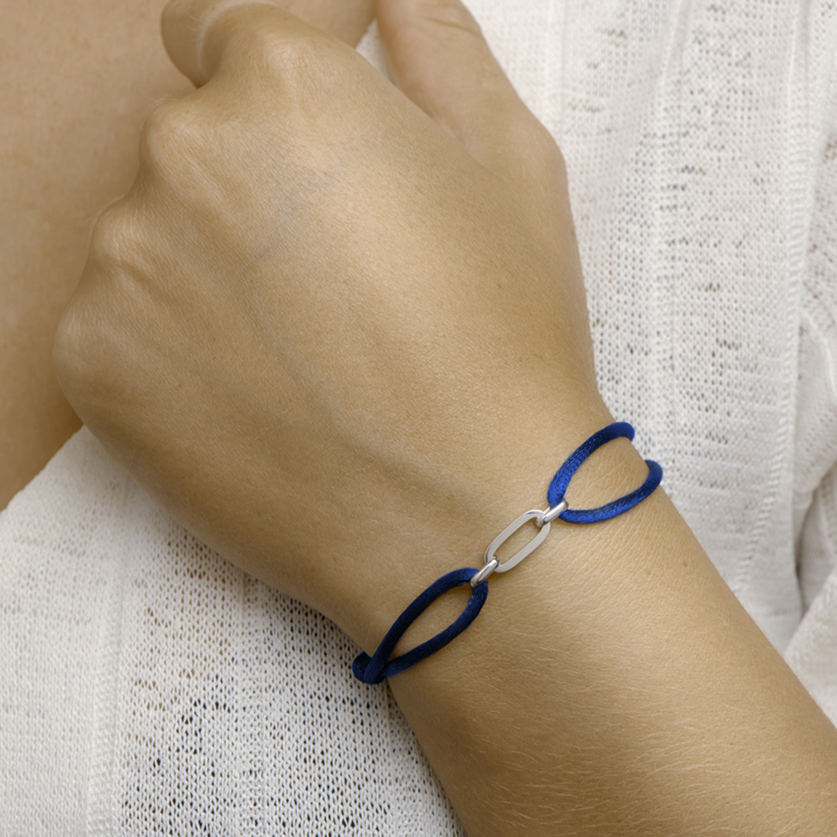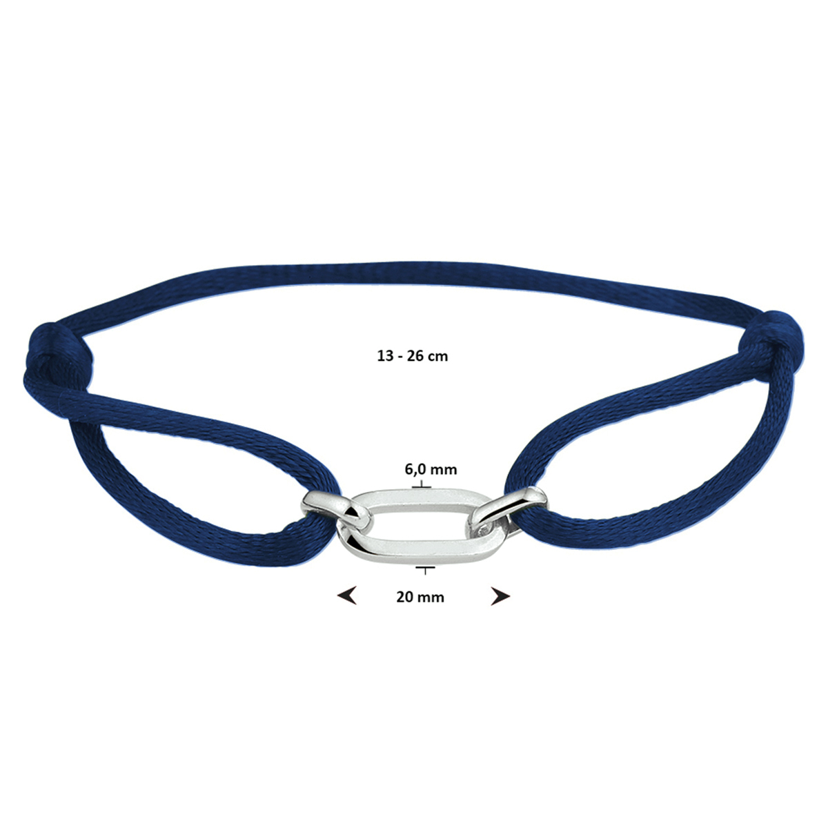 Donkerblauw gevlochten armband uitgevoerd met een gerhodineerd 925 zilveren element. De armband heeft draaglengtes van 13 tot 26cm. Het element heeft een afmeting van 20x6mm.