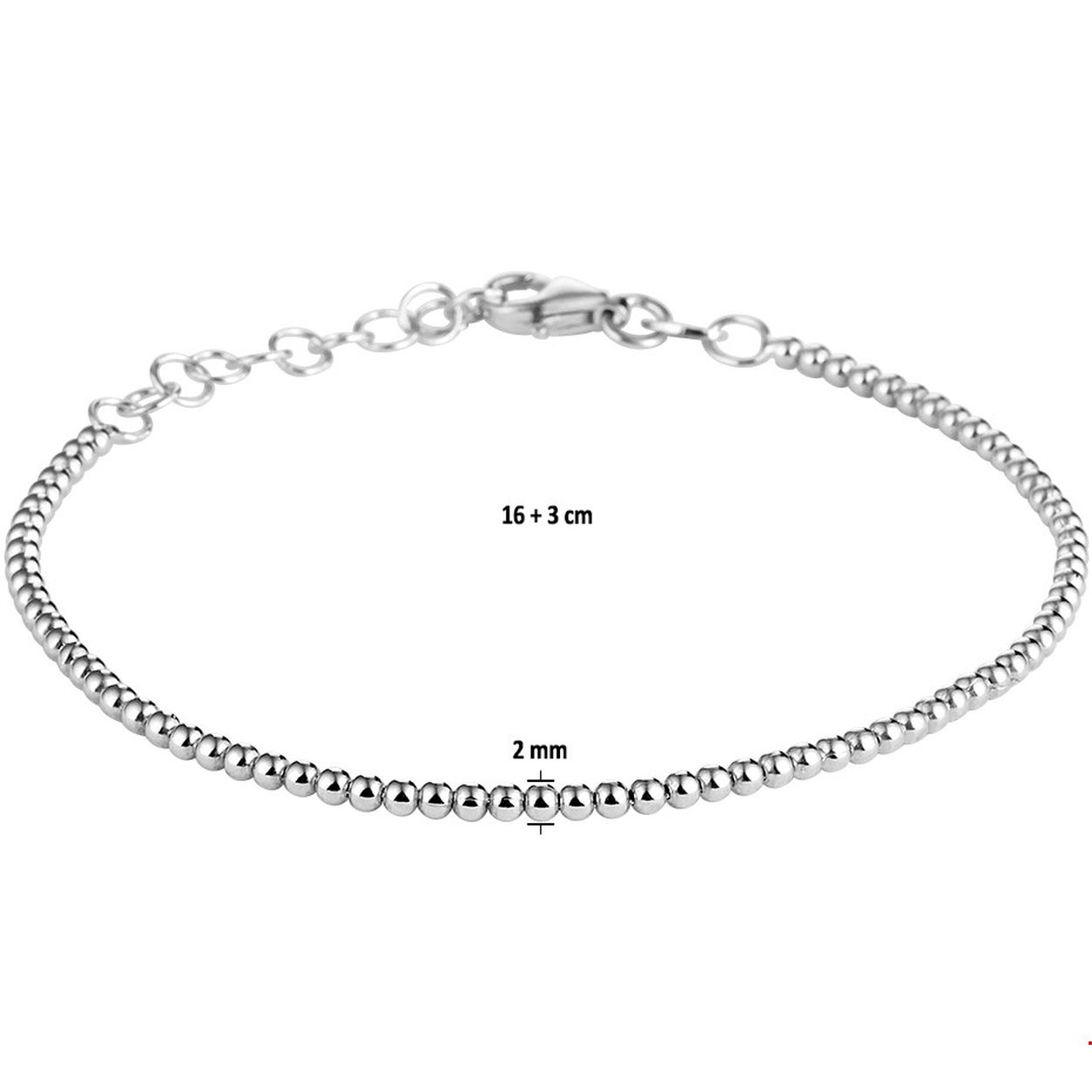 Beschrijving: Trendy gerhodineerd zilveren armband met een draaglengte van 16cm en een extensie van 3cm. Uitgevoerd met bolletjes van 2mm in diameter en een stevige karabijn sluiting. Info: Gerhodineerd zilver is door de rhodiumlaag beter bestand tegen verkleuren en krassen.