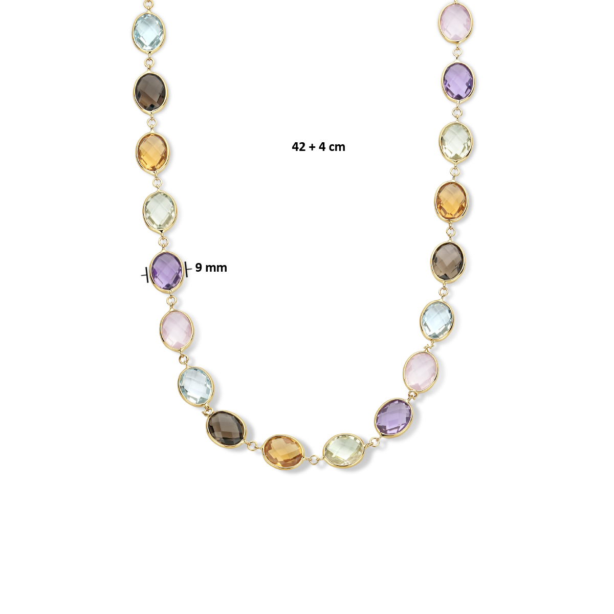14k Geelgouden collier met verschillende stenen zoals: citrien, rookkwarts, groen amethyst, amethyst, roze kwarts en licht blauw topaas. Iedere steen heeft een steengewicht van 1.80ct per stuk. Het collier heeft een draaglengte van 42cm en een extensie van 4cm.