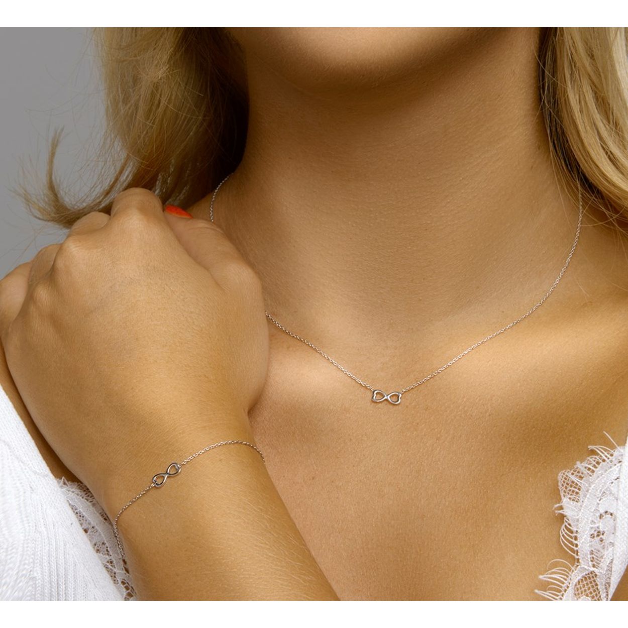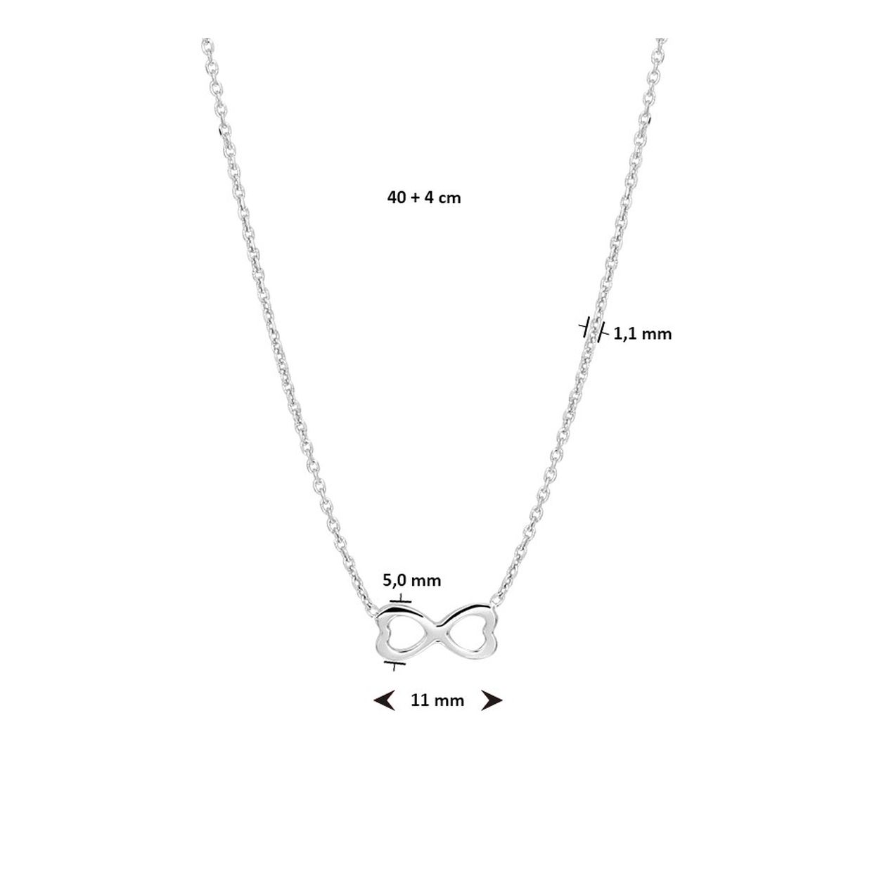 Gerhodineerd 925 zilveren collier uitgevoerd met een infinity teken en hartjes. Het collier heeft een draaglengte van 40cm met een extensie van 4cm en een stevige karabijn sluiting. Het hangertje heeft een afmeting van 5x11mm.