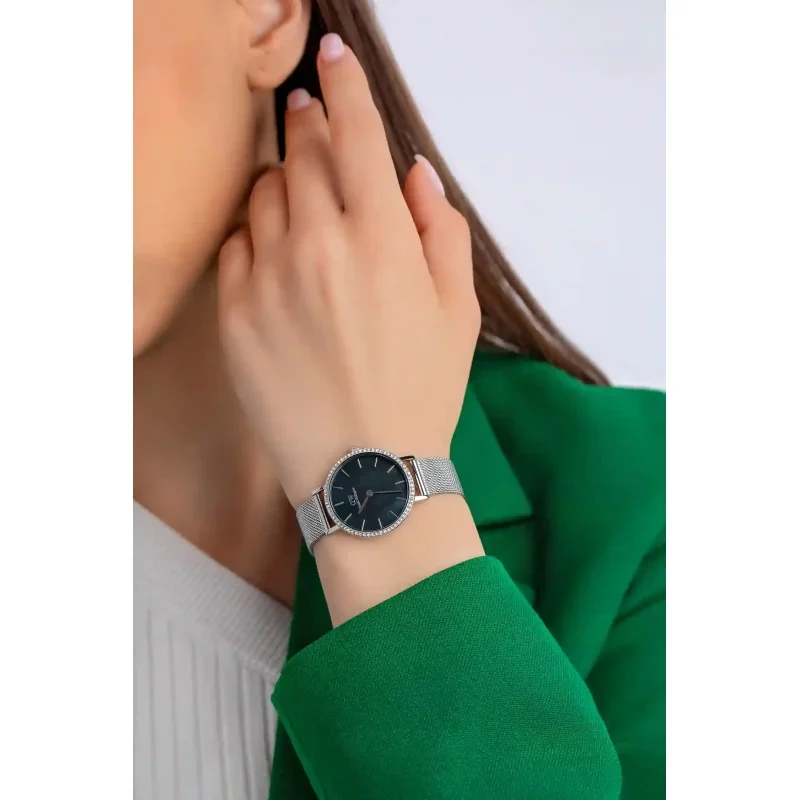 Daniel Wellington dames horloge, stelen milanese band, ronde kast met rondom steentjes, zwarte parelmoer wijzerplaat