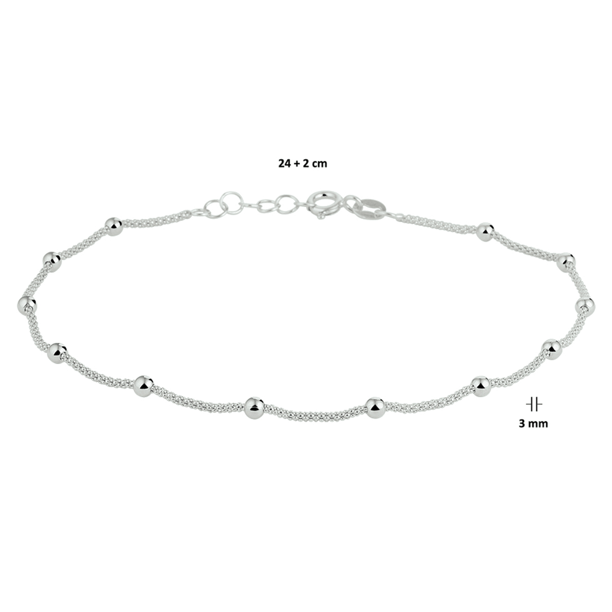 Beschrijving: Trendy gerhodineerd zilveren enkelbandje uitgevoerd met poli afgewerkte bolletjes van 3mm. Met een draaglengte van 24cm en een extensie van 2cm. Tip: Leuk om kado te geven! Info: Gerhodineerd zilver is door de rhodiumlaag beter bestand tegen verkleuren en krassen.