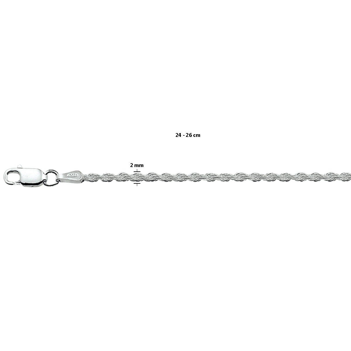 Gerhodineerd 925 zilveren enkelbandje uitgevoerd met een karabijn sluiting. Het enkelbandje heeft draaglengtes van 24 en 26cm. De schakelbreedte is 2mm.