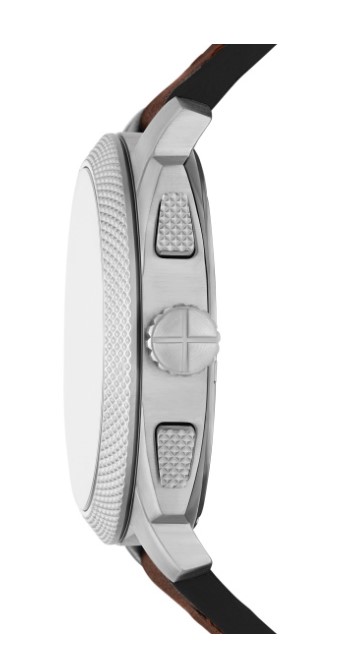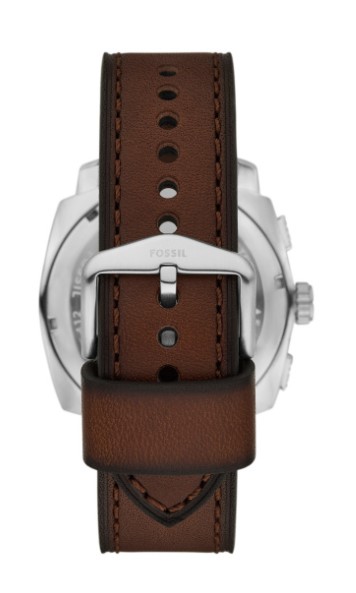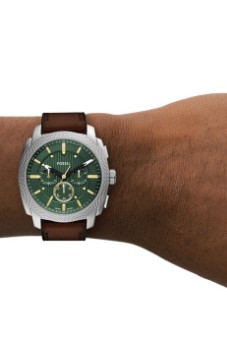 Fossil heren horloge, bruine lederen band, stalen kast, groene wijzerplaat met goudkleurige index