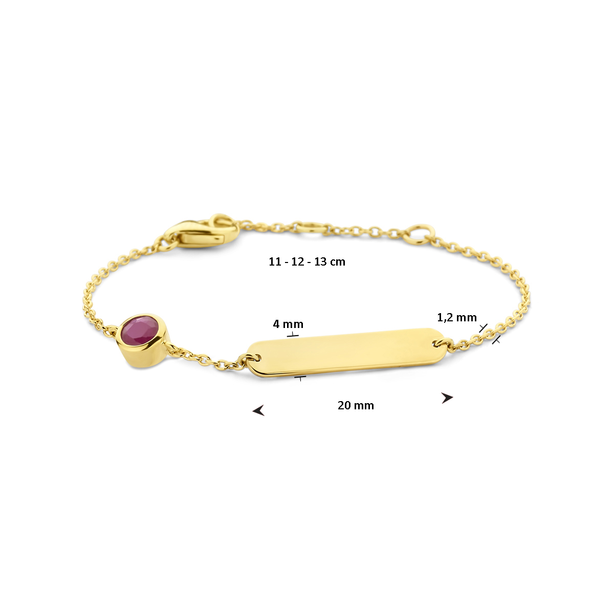 14k Geelgoudengraveerarmband uitgevoerd met een schitterende robijn. De armband heeft draaglengtes van 11-12-13cm. De schakelbreedte is 1.2mm.De graveerplaat heeft een afmeting van 4x20mm en een dikte van 0.8mm.