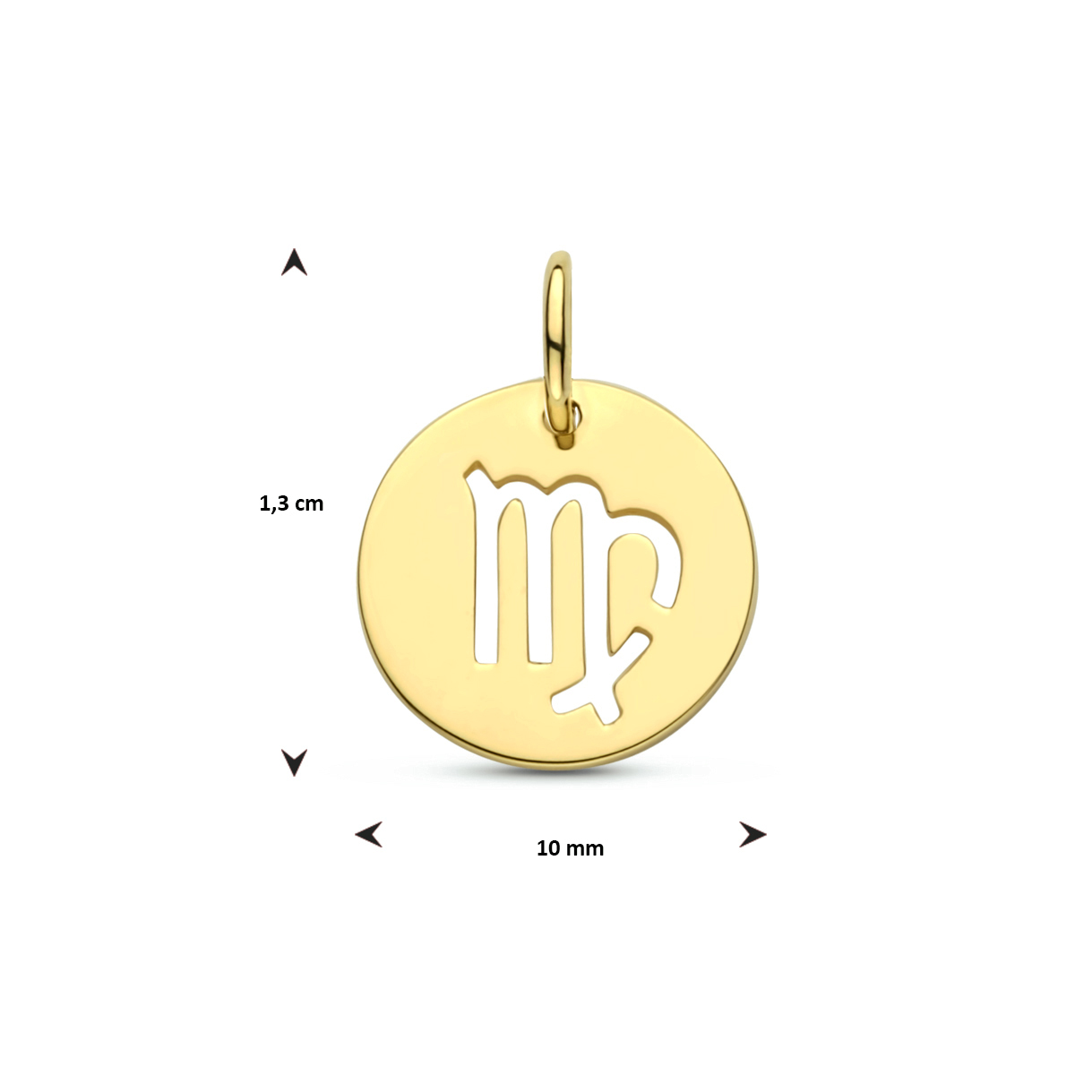 14k Geelgouden hanger uitgevoerd met het sterrenbeeld maagd. De hanger heeft een totale hoogte van 1.3cm en een diameter van 10mm.