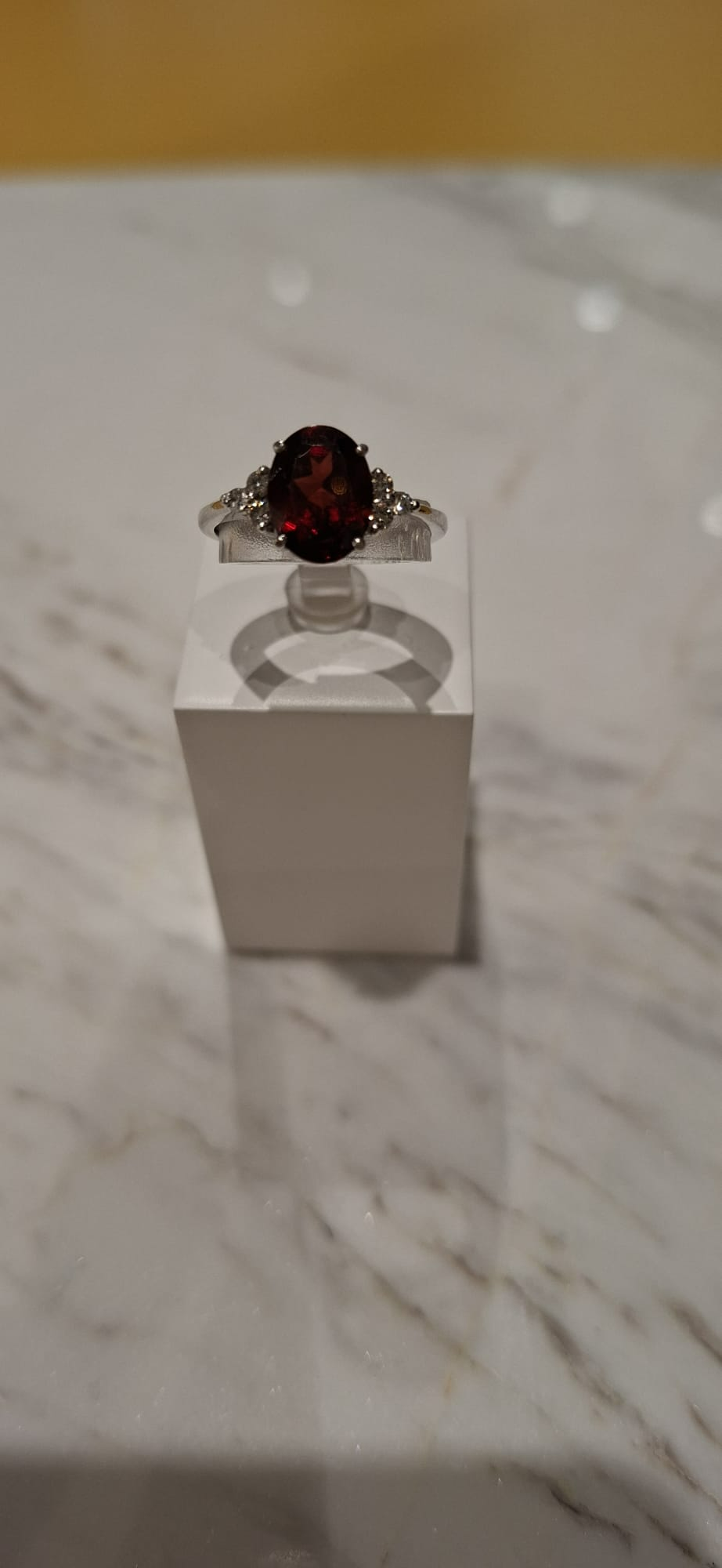 OCC-RINGGRANAAT. Witgouden damesring 18 karaat. Occasion. Granaat met 6x diamant. maat 50