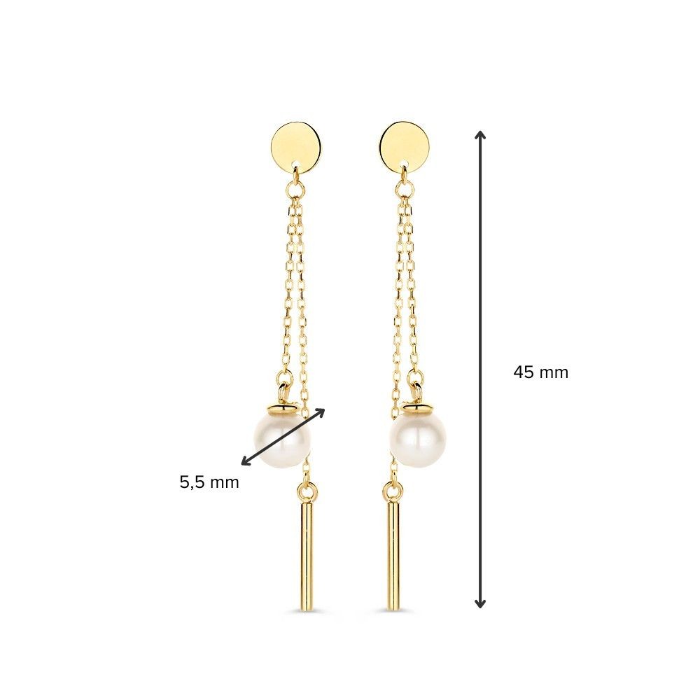 Speelse, gouden oorbellen met een pareltje en gouden staafje als hangede elementen.