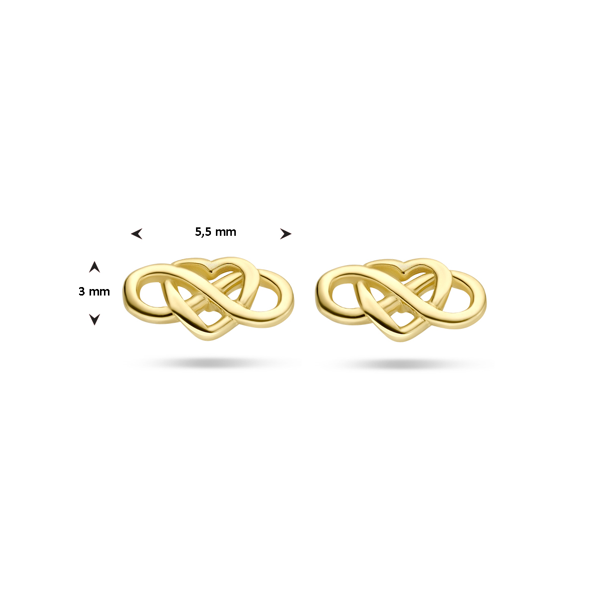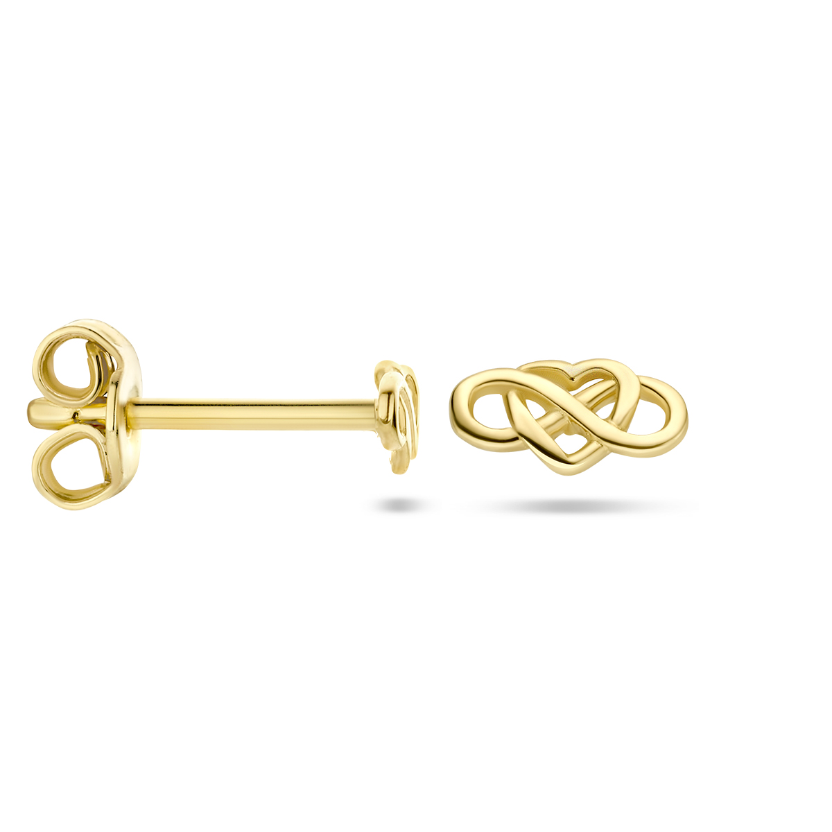 14k Geelgouden oorknoppen uitgevoerd met een hart en een infinity. De oorknoppen hebben een afmeting van 3x5.5mm.