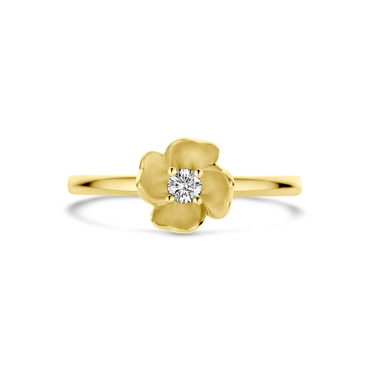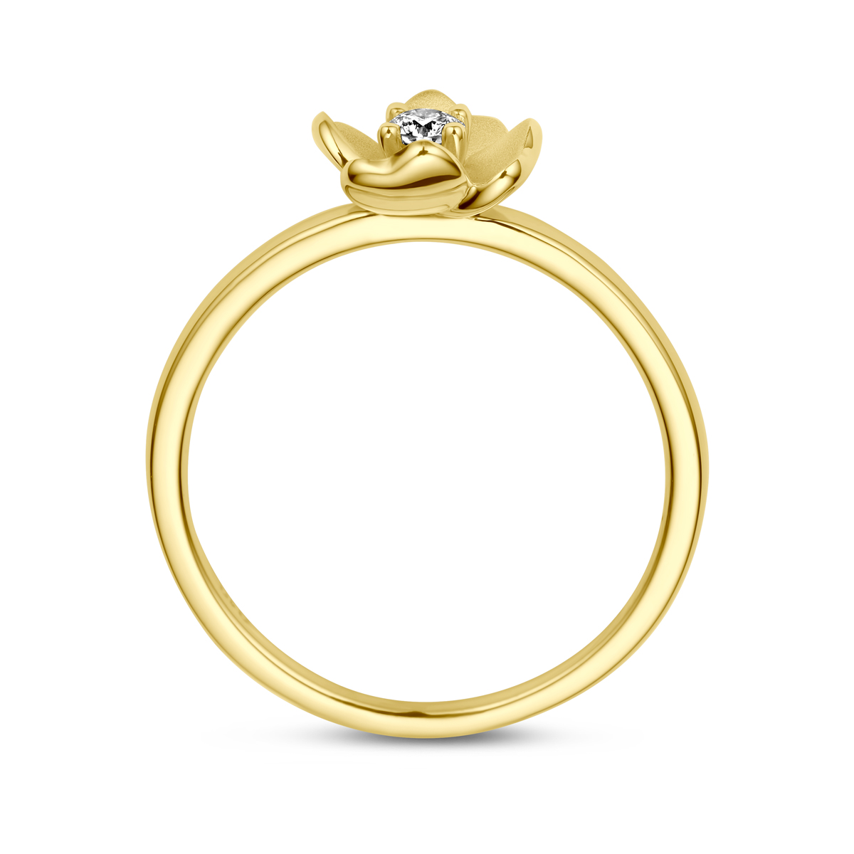 14k Geelgouden ring uitgevoerd met een bloem een diamant. De ring heeft een breedte van 8.5mm en het diamantgewicht is 0.10ct.