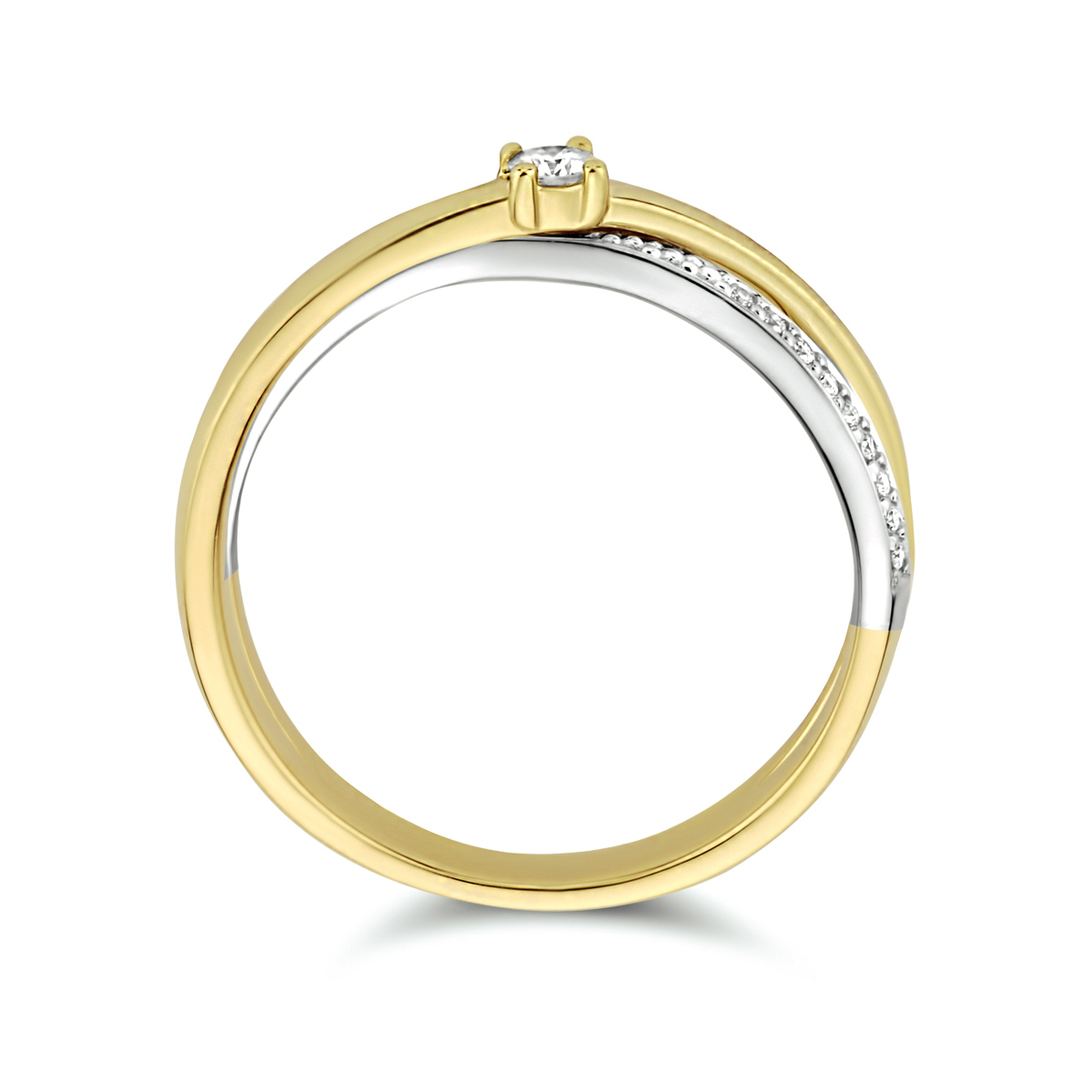 14k Bicolor geel- en witgouden ring uitgevoerd met schitterend diamant. De ring heeft een breedte van 5mm. De centersteen heeft een steengewicht van 0.06ct.