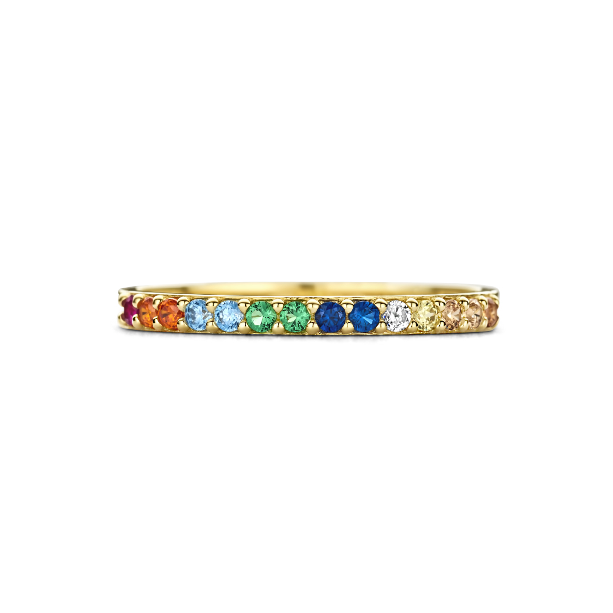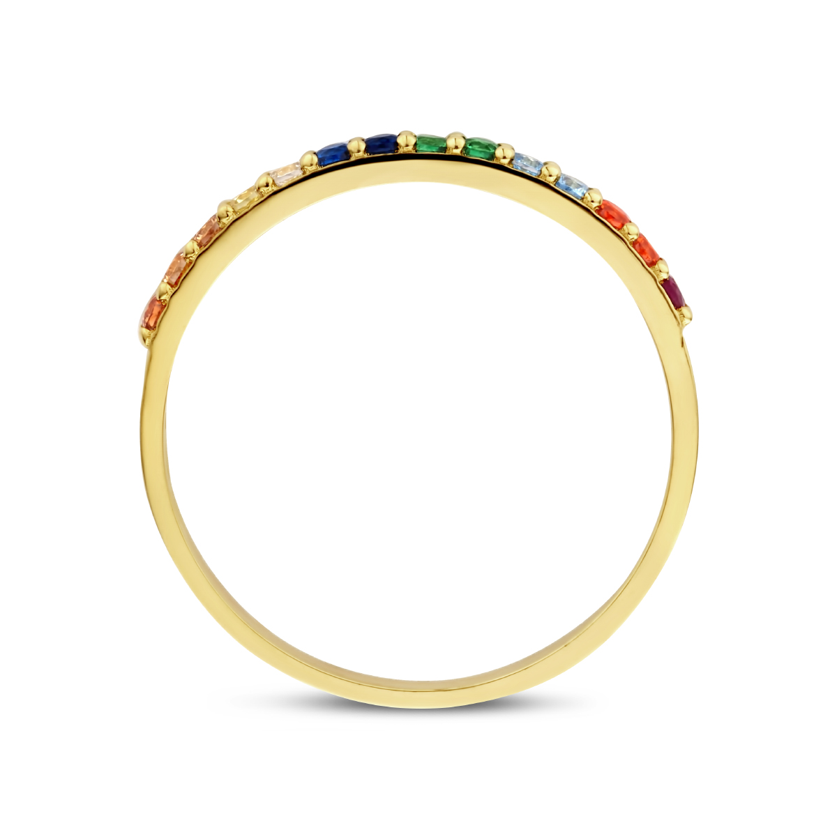 14k Geelgouden ring uitgevoerd met gekleurde zirkonia.