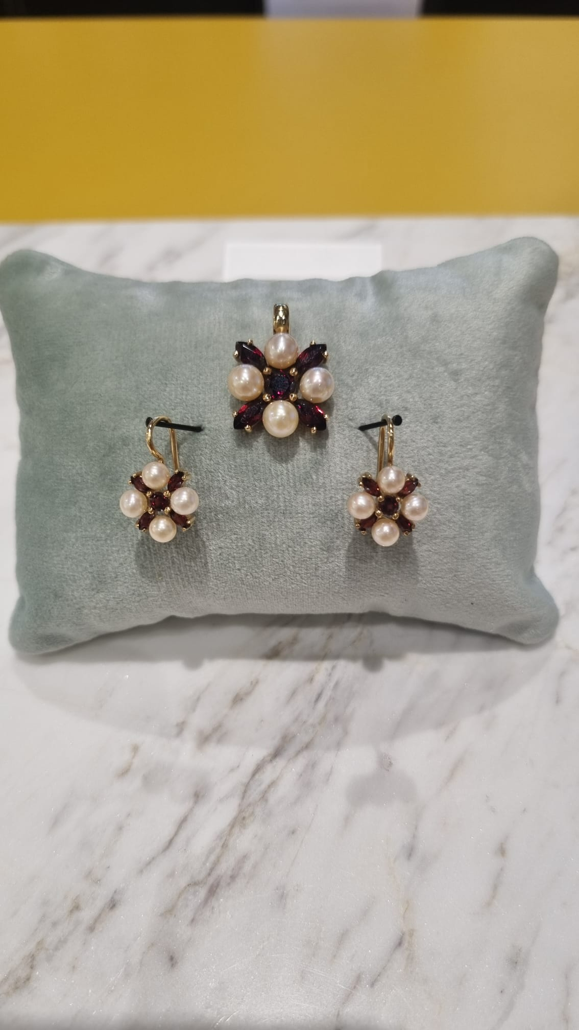VINTAGE017. Vintage occasion 14 karaat geelgouden hanger met zoetwaterparel en granaat.